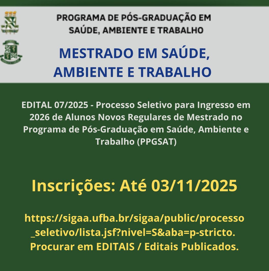 Estão abertas as inscrições para o processo seletivo do curso de Mestrado Acadêmico em Saúde, Ambiente e Trabalho, para o período letivo de 2026.1 do Programa de Programa de Pós-Graduação em Saúde, Ambiente e Trabalho (PPGSAT).